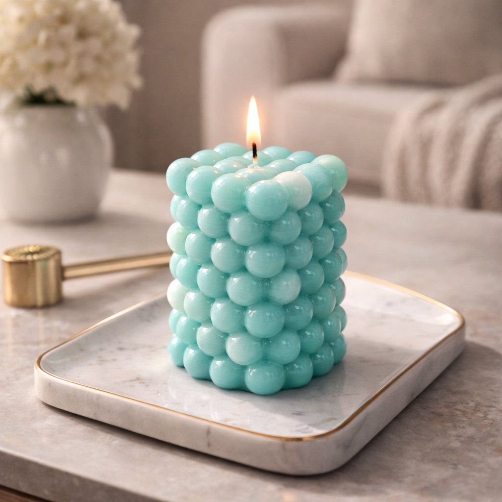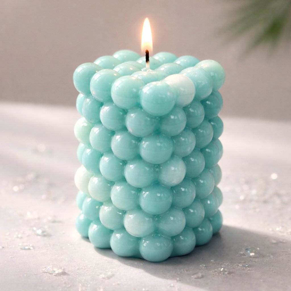 Designová svíčka s moderním tvarem BUBBLE a výraznou tyrkysovou barvou, která vnese do prostoru styl i klid. Je vhodná jak jako dekorativní prvek, tak jako milý dárek, který zaujme na první pohled.