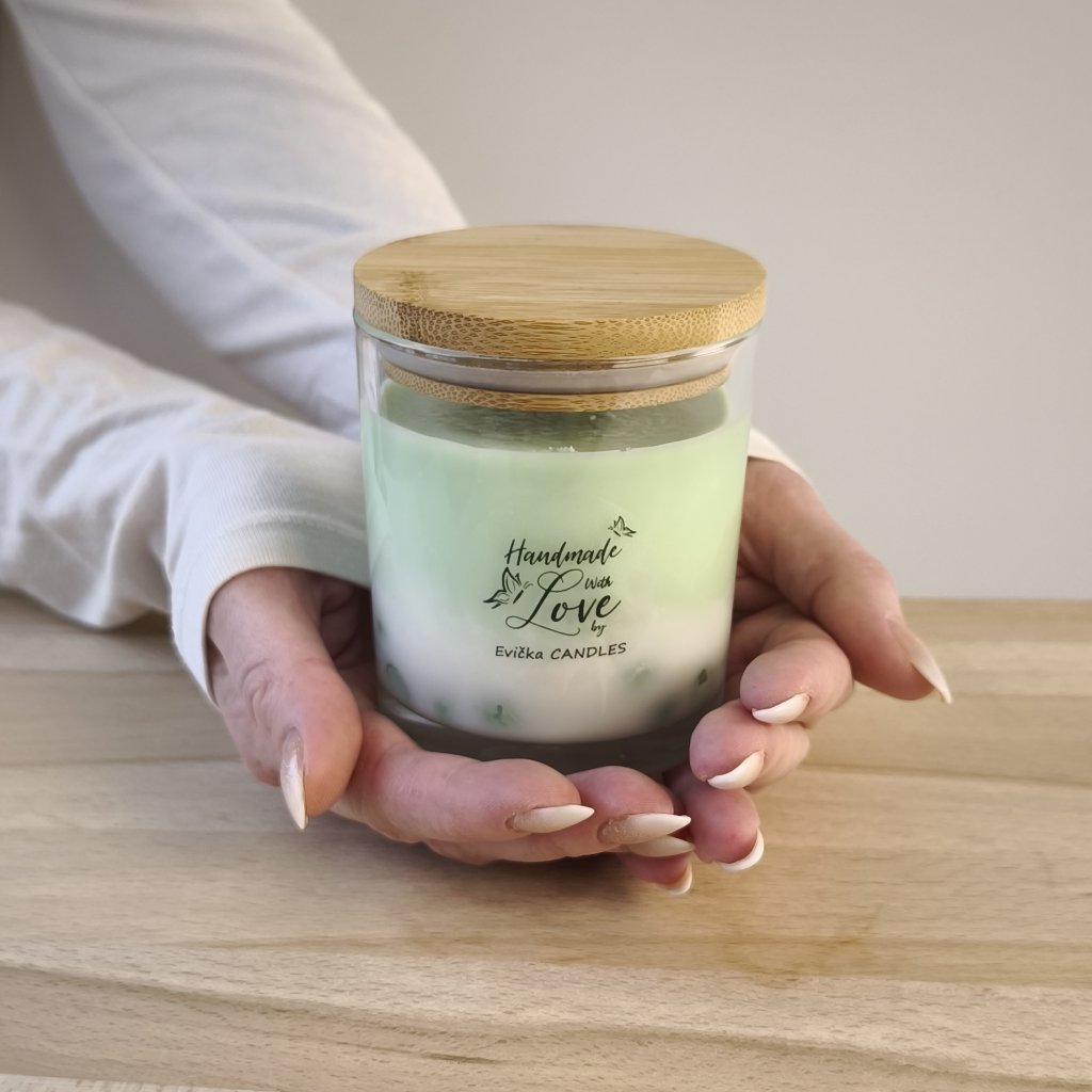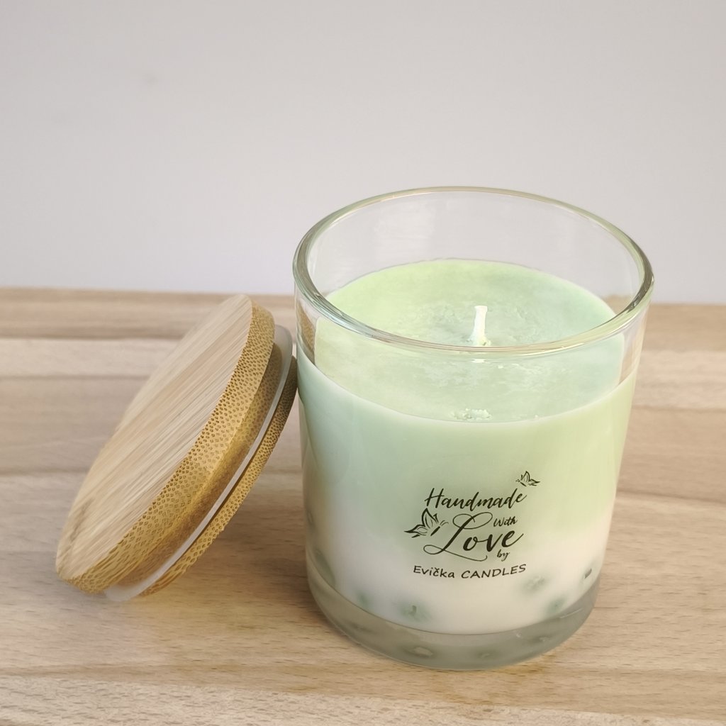 Svíčka je zalitá do elegantní skleněné nádoby s bambusovým víčkem. Jemné barevné přechody a ruční zpracování dělají z každého kusu originál. Díky kvalitnímu vosku hoří rovnoměrně a dlouho.