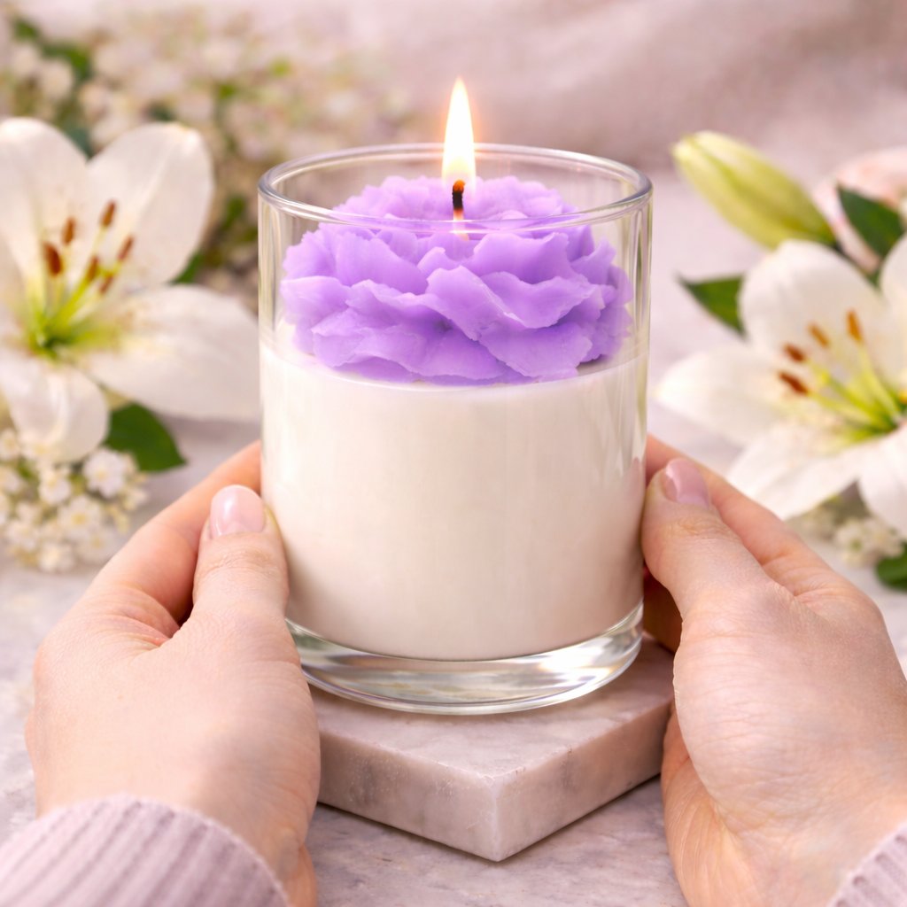 Ručně vyráběná sójová svíčka s jemnou vůní lilie v elegantní skleněné nádobě, která vnese do prostoru lehkost a svěžest. Je ideální jako dekorativní prvek i jako vkusný dárek pro chvíle odpočinku.