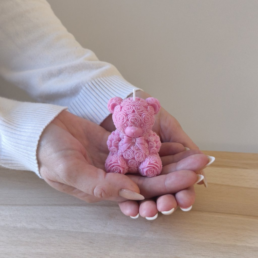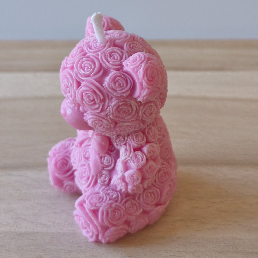 Ručně odlévaná svíčka ve tvaru roztomilého medvídka s květinovým vzorem, která vnáší do prostoru jemnou dekorativní atmosféru. Skvěle doplňuje interiér a zároveň je stylovým dárkem, který potěší na první pohled.
